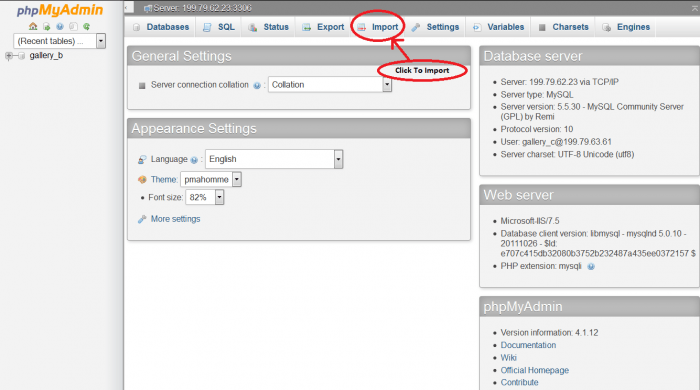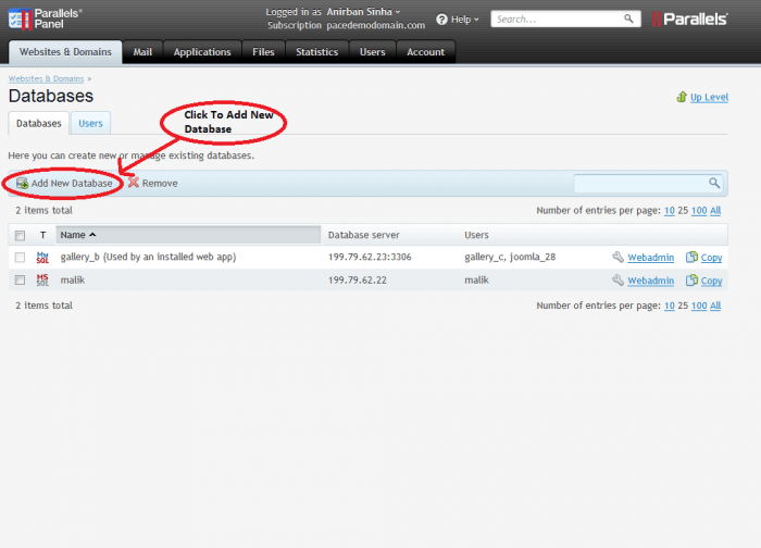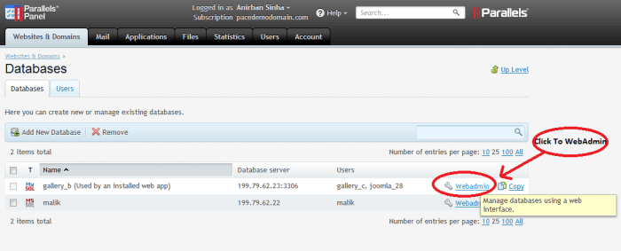 For Linux cPanel Hosting Control Panel, the MySQL Database creation process is really simplified by the “MySQL Database Wizard” option available under the “Database” section on homepage of cPanel. NOTE:You will need to change the Data source/Server name, Database name, Database Username and Database password in your application’s connection String as per created above. b. Restore your MySQL Database Once your database is already created, the next step is to launch PHPMyAdmin which is a web based MySQL Database management tool. You can find PHPMyAdmin option under following sections depending upon the Hosting Control Panel you are using. Parallels Plesk – Go to Databases section from Homepage and click on “Webadmin” link to the right of the Database in the list you want to restore.